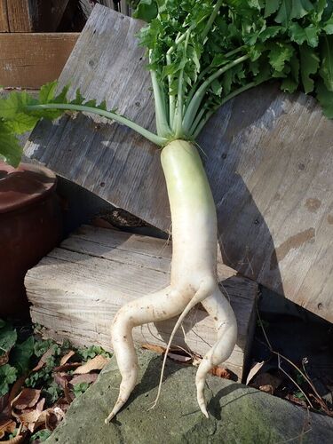 先日収穫したダイコンです。 ちょっと下品ですが自分には酔っ払いの立小便のイメージが湧きました。 みなさんは? イメージは色々でしょうが